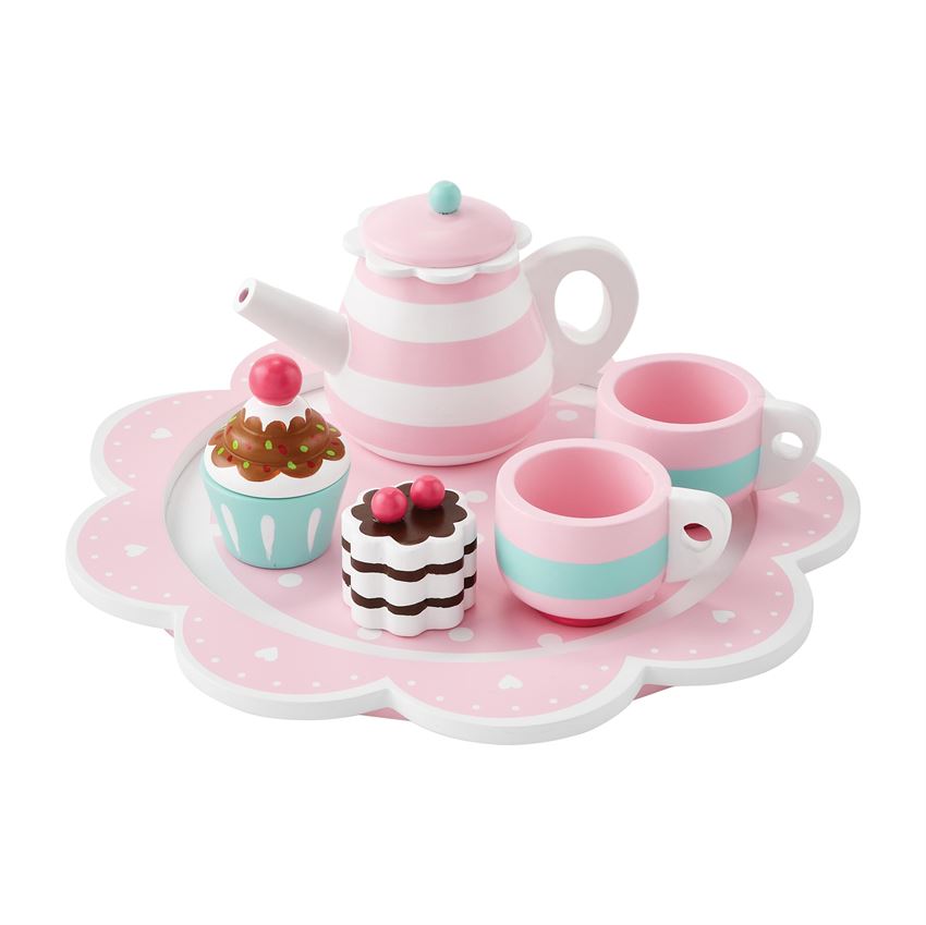 The Mud Pie Wooden Tea Set is a 6-piece set. Wooden play tea pot on scalloped tray arrives with tea mugs and pastries for two! Ages 3 and up.