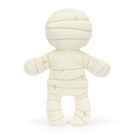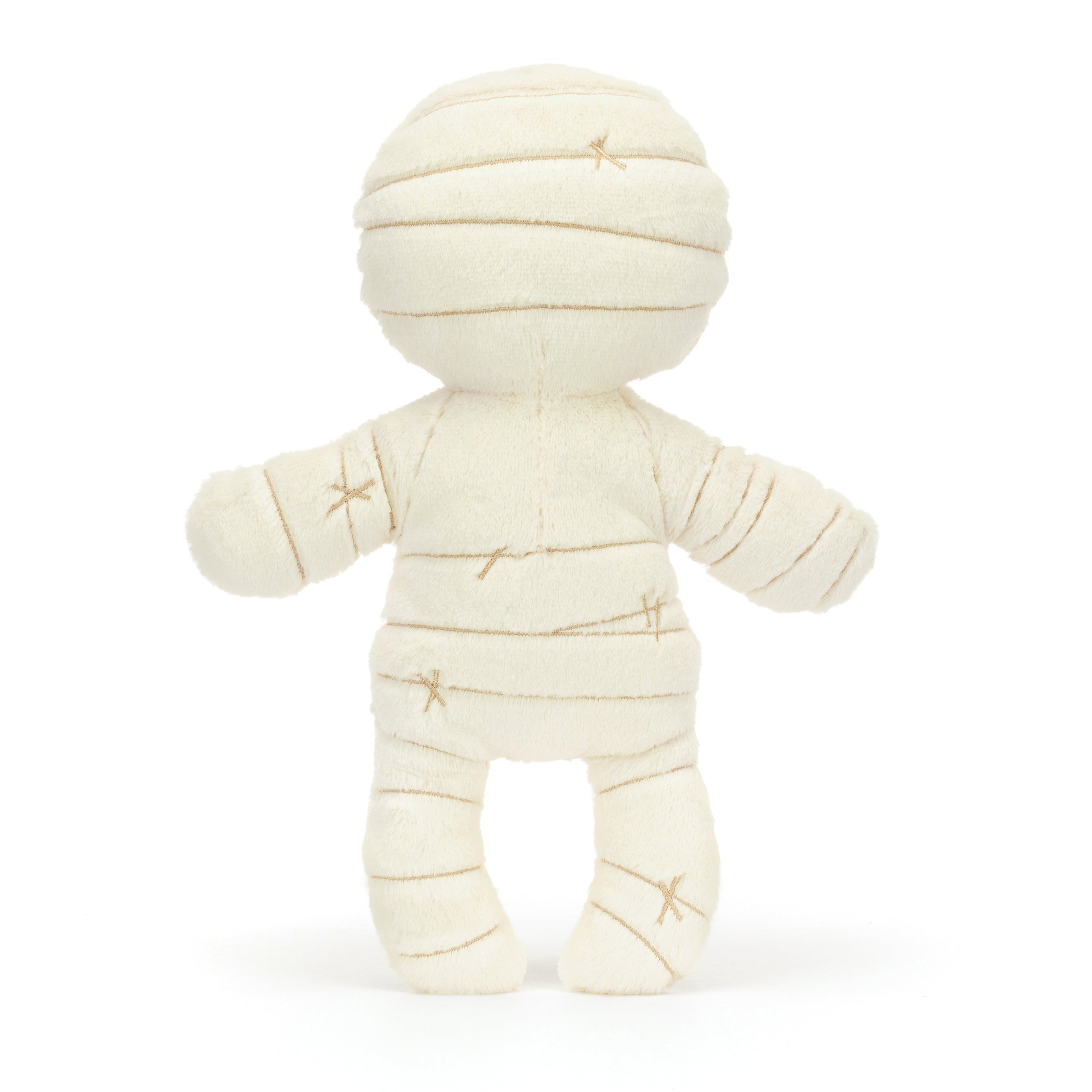 Even skeletons need Halloween costumes! Meet Mummy Bob – an undead softy in cream fur bandages, with delicate embroidered stitches. Look closely to see Bob's shiny eyes peeking out from all those layers!