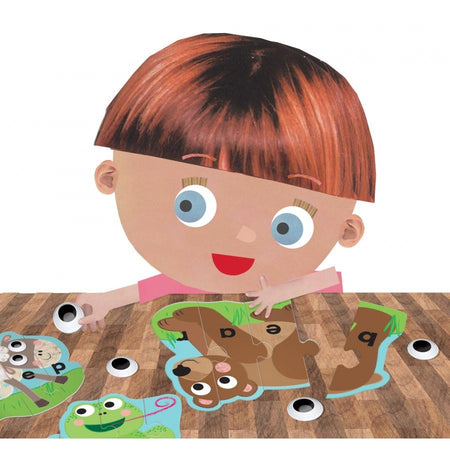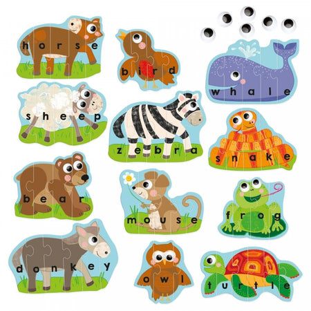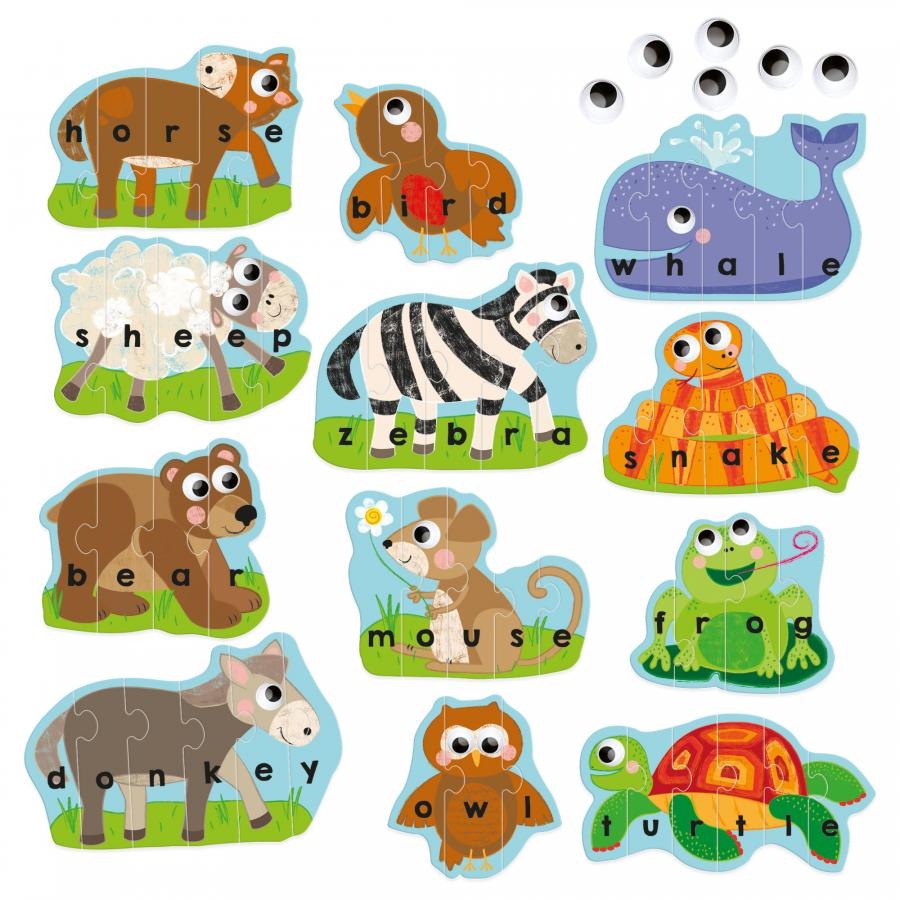 Put the self-correcting puzzle of the animals together, and learn how to read and write your first words. In addition, you can animate the animal shapes by adding adhesive eyes.
