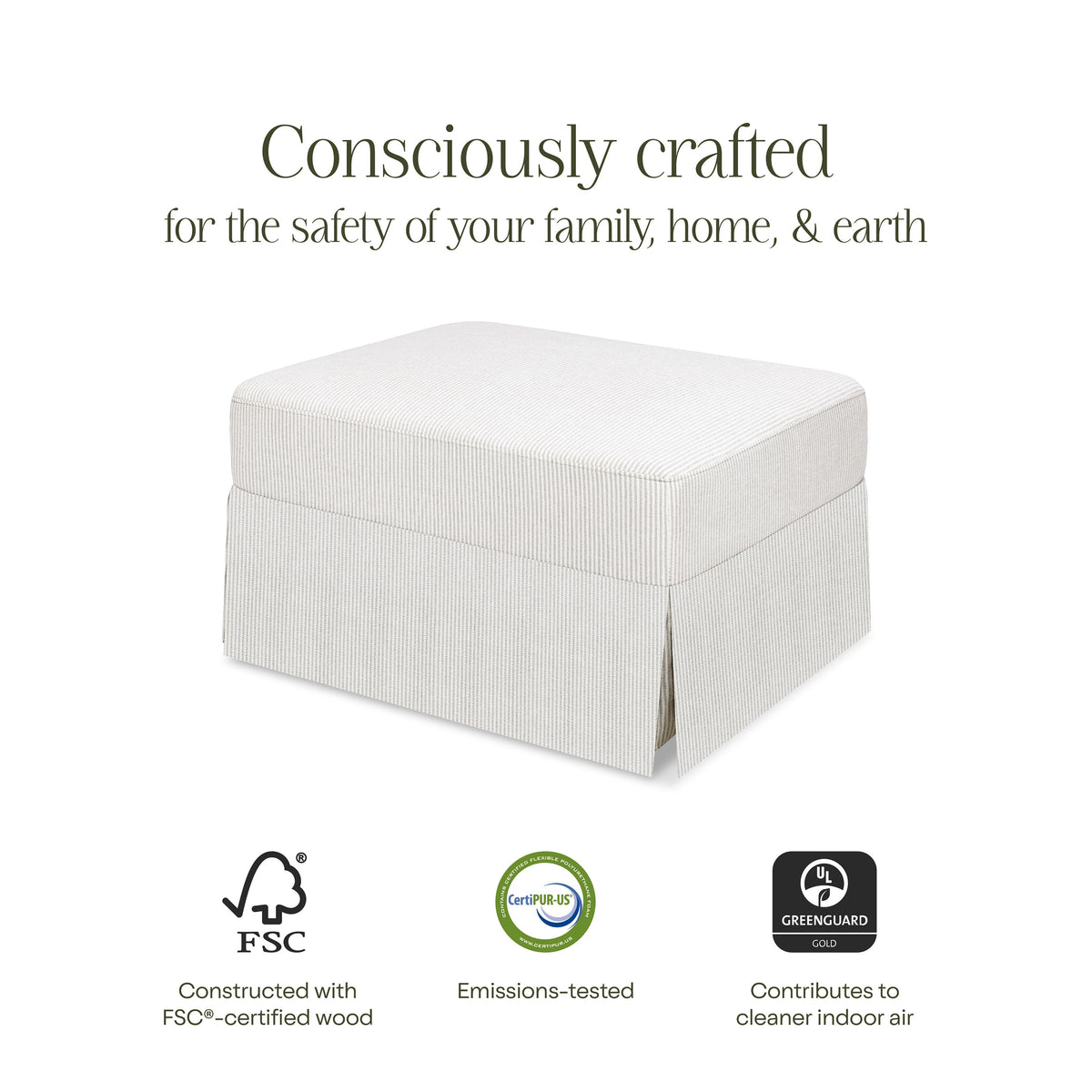 The Crawford Ottoman offers a modern take on traditional slipcover style and brings nursery comfort to a new level. It's the perfect pair to our Crawford Glider, which features a plush pillowback design, added lumbar pillow, and wide seat. The glider and ottoman work together to create a back-and-forth gliding motion that helps you rock your baby to sleep with ease.