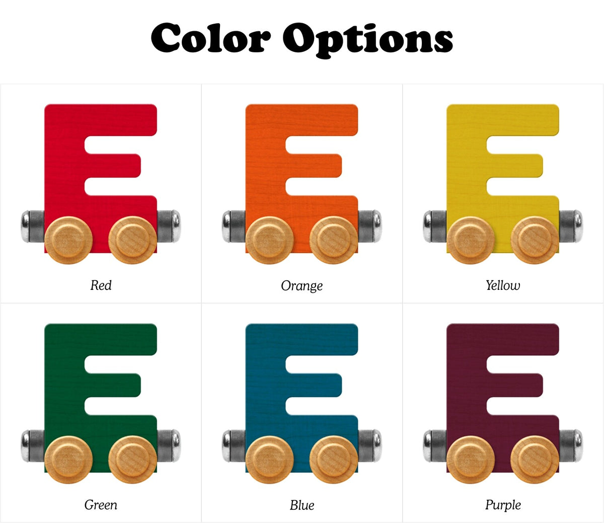 Bright Color NameTrains Letter Car E is crafted from locally sourced and sustainably harvested hard maple. Magnets allow you to attach cars to form names and words. Each Bright Color NameTrains Letter Car is available in one of 6 colors: red, orange, yellow, green, blue, or purple. The Letter Car measures about 2.4" tall and about 2.4" long. Compatible with our and other wooden train sets. Non-toxic finish.