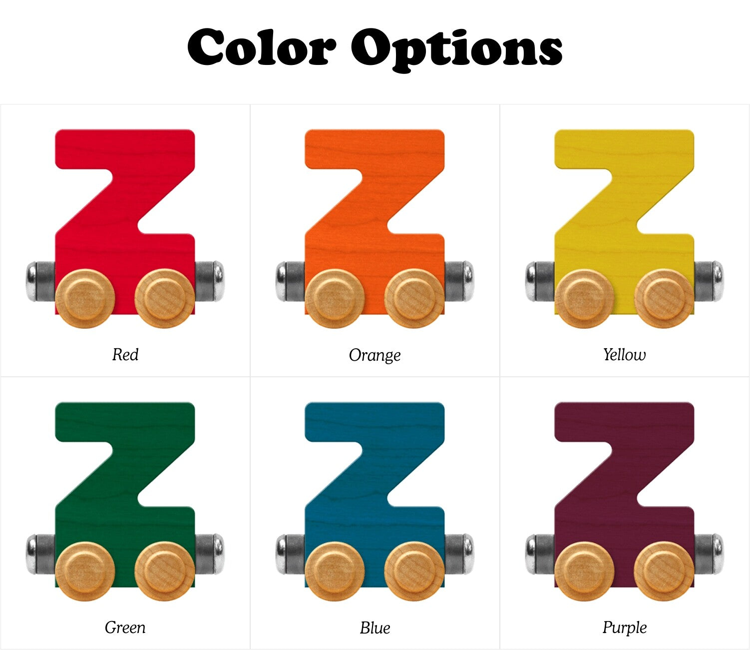 Bright Color NameTrains Letter Car Z is crafted from locally sourced and sustainably harvested hard maple. Magnets allow you to attach cars to form names and words. Each Bright Color NameTrains Letter Car is available in one of 6 colors: red, orange, yellow, green, blue, or purple. The Letter Car measures about 2.4" tall and about 2.4" long. Compatible with our and other wooden train sets. Non-toxic finish.