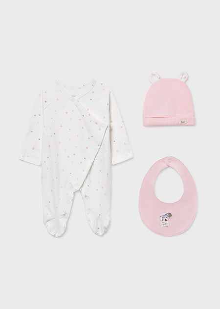 MAYORAL NEWBORN SAFARI DOT 3-PIECE GIFT SET - SNAP FOOTIE, HAT & BIB