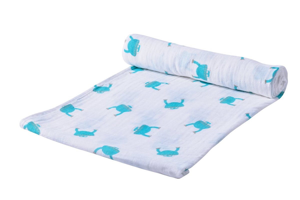 Introducing the Newcastle Classics Space Robot Swaddle Blanket. Soft as silk, breathable, pre-washed, muslin swaddle made from our natural bamboo fibers. Use this swaddle as a stroller or nursing cover, changing pad cover, burp cloth, tummy time blanket and more. The breathable fabric helps reduce the risk of overheating while the generous size makes swaddling a breeze.
