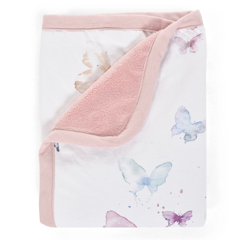 Drape your baby in plush luxury with Oilo'S Butterfly Cuddle Blanket. Snuggly plush on one side for the perfect touch against baby’s delicate skin, while a modern soft knit jersey pattern covers the other side for instant style on the go. Our blanket measures a generous 30” x 40” for a cozy nap time cover, or a perfect stroller blanket.