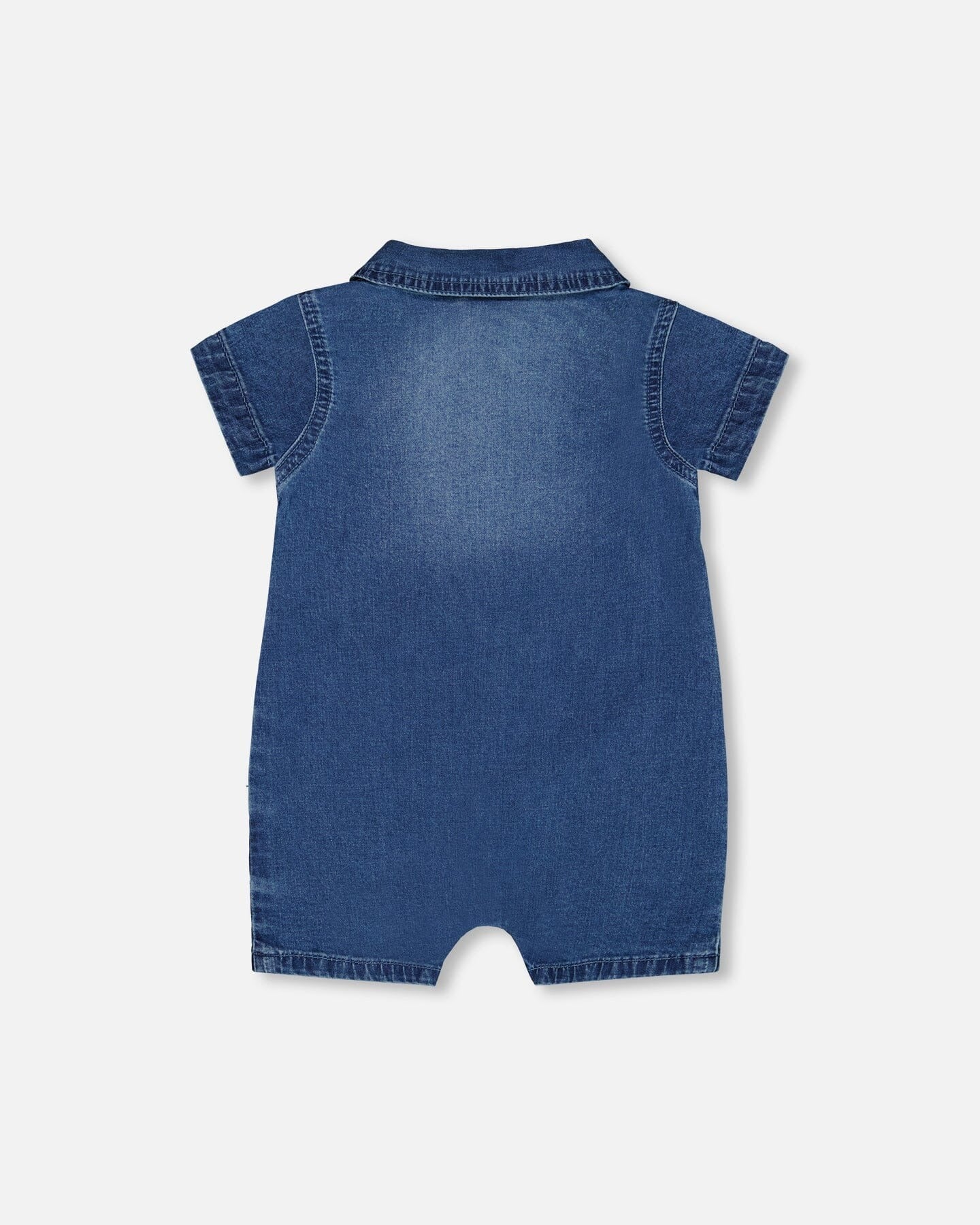 Our One-Piece Denim Romper Dark Denim Blue is a must-have for the baby boy who loves the look and feel of denim! This adorable one-piece is made from stretch cotton denim and features a short sleeve silhouette with a soft denim collar, a five button placket, and a patch pocket on the left chest. Snap legs make diaper changes a cinch!
