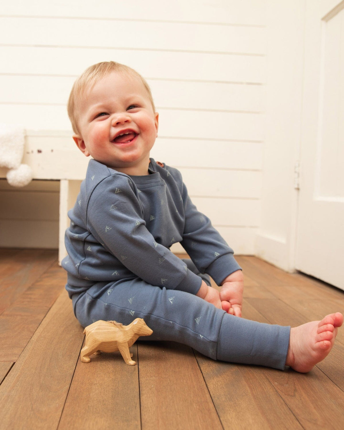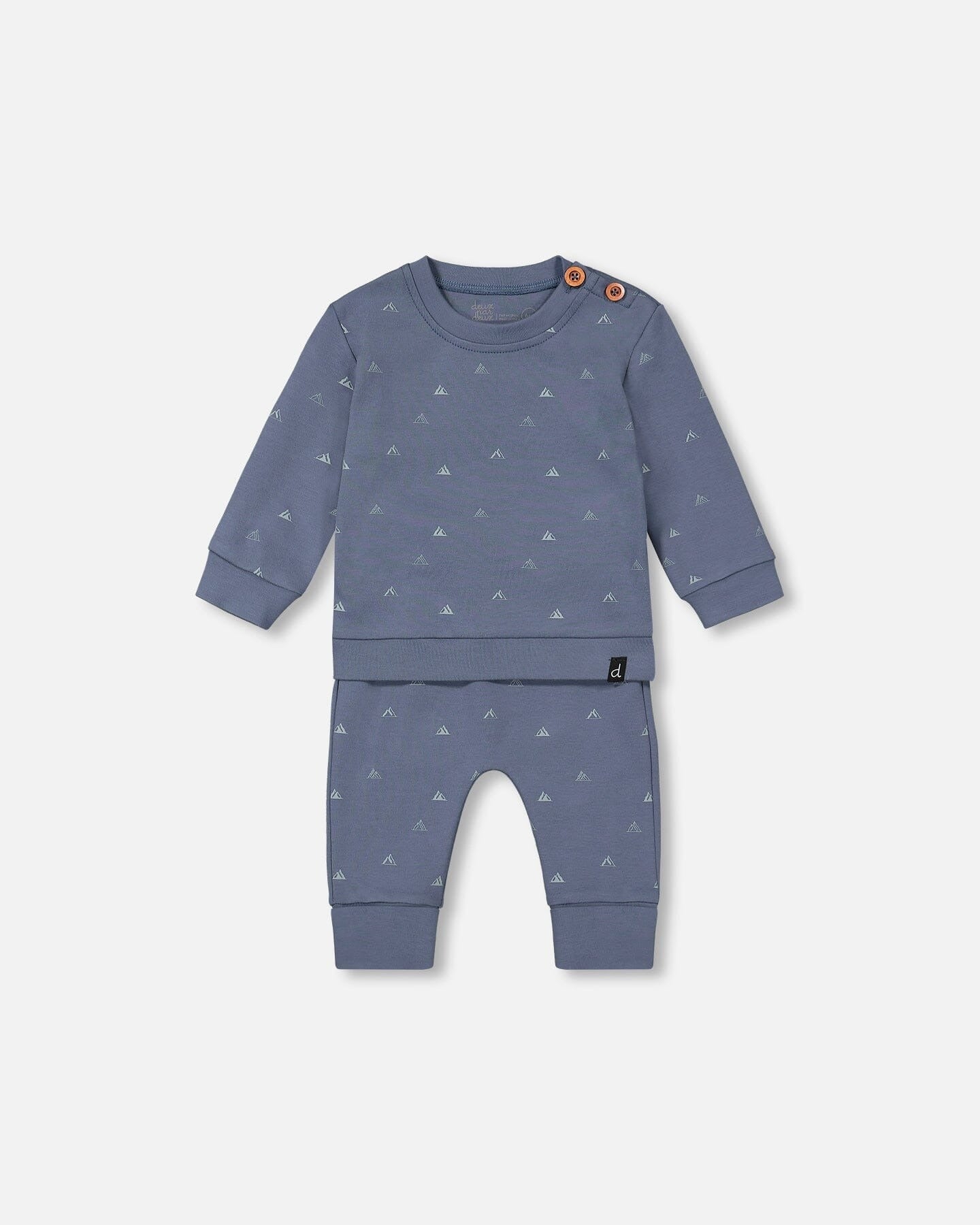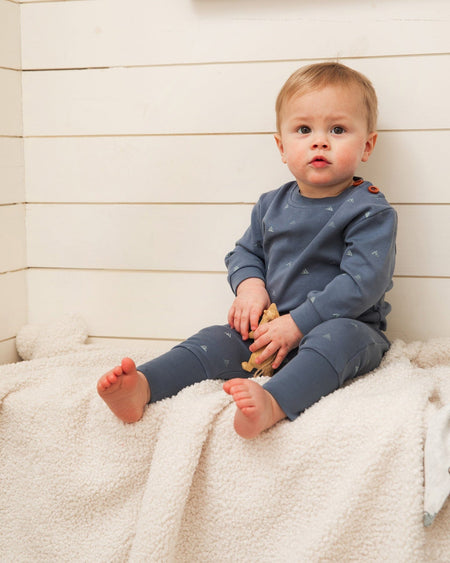 An allover mountain print makes this set perfect for the little boy adventurer. The Organic Cotton Printed Top and Pants Set French Navy Little Mountains features a long sleeve top with a crew neckline, two buttons on the shoulder, and a matching pull-on pant adapting to the grow of your little one's with a foldover waist and ankles.