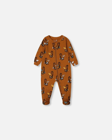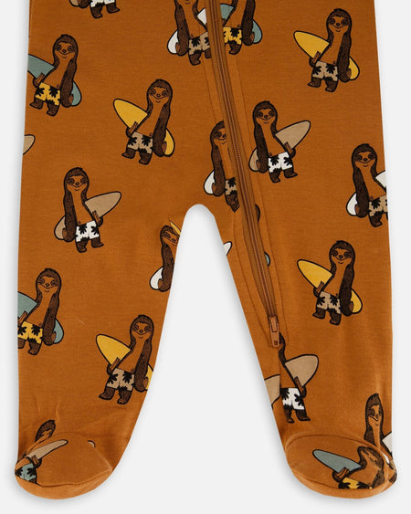 Cozy up for a peaceful night's sleep in our Printed Organic Cotton One-Piece Pajama Sloths on Tan Background. This super soft footie pajama features long sleeves, a round neckline, and an asymmetrical zipper closure. An allover sloth print makes it perfect for any sweet baby boy!