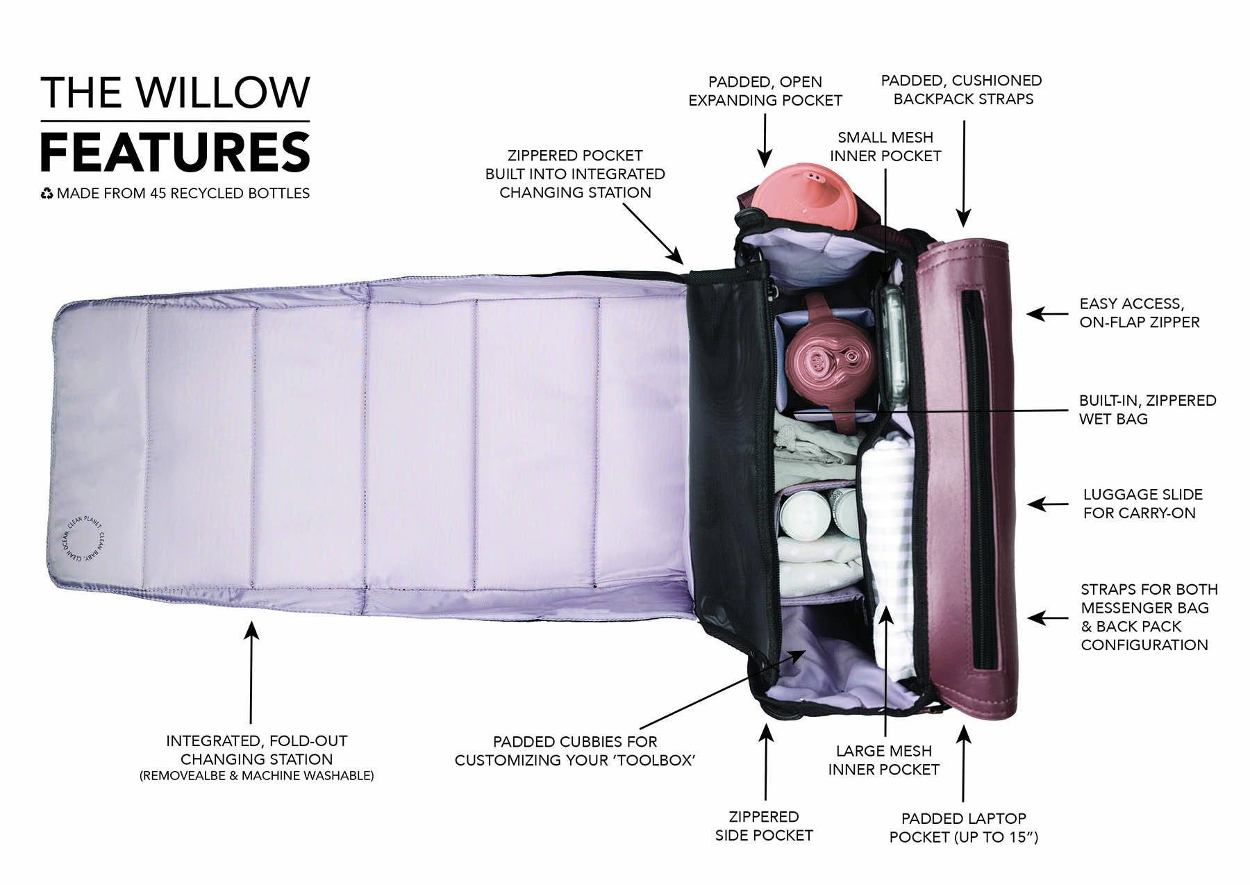 The Willow can go from backpack to messenger bag in a snap. and can carry everything you need for a day at the beach, an evening in the park, and everything in between.