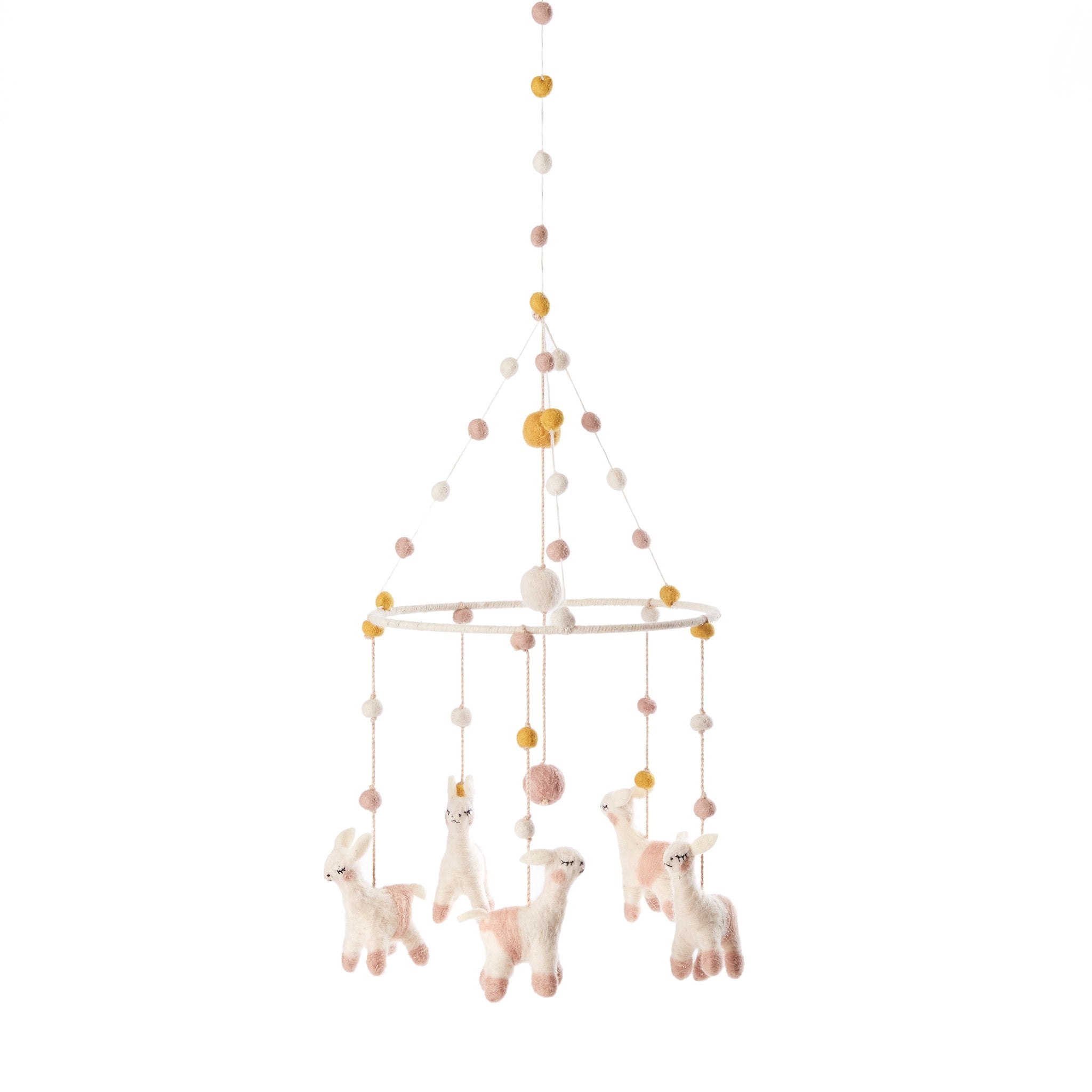 Introducing the Pehr Designs Lovely Llama Mobile. The Llama is a symbol of strength and perseverance, qualities that we all wish for our little ones! Now they can keep a watchful eye with our delightful Llama Mobile, made from 100% wool felt. Dimensions approximtely: 28”h x 9”w