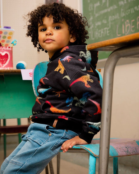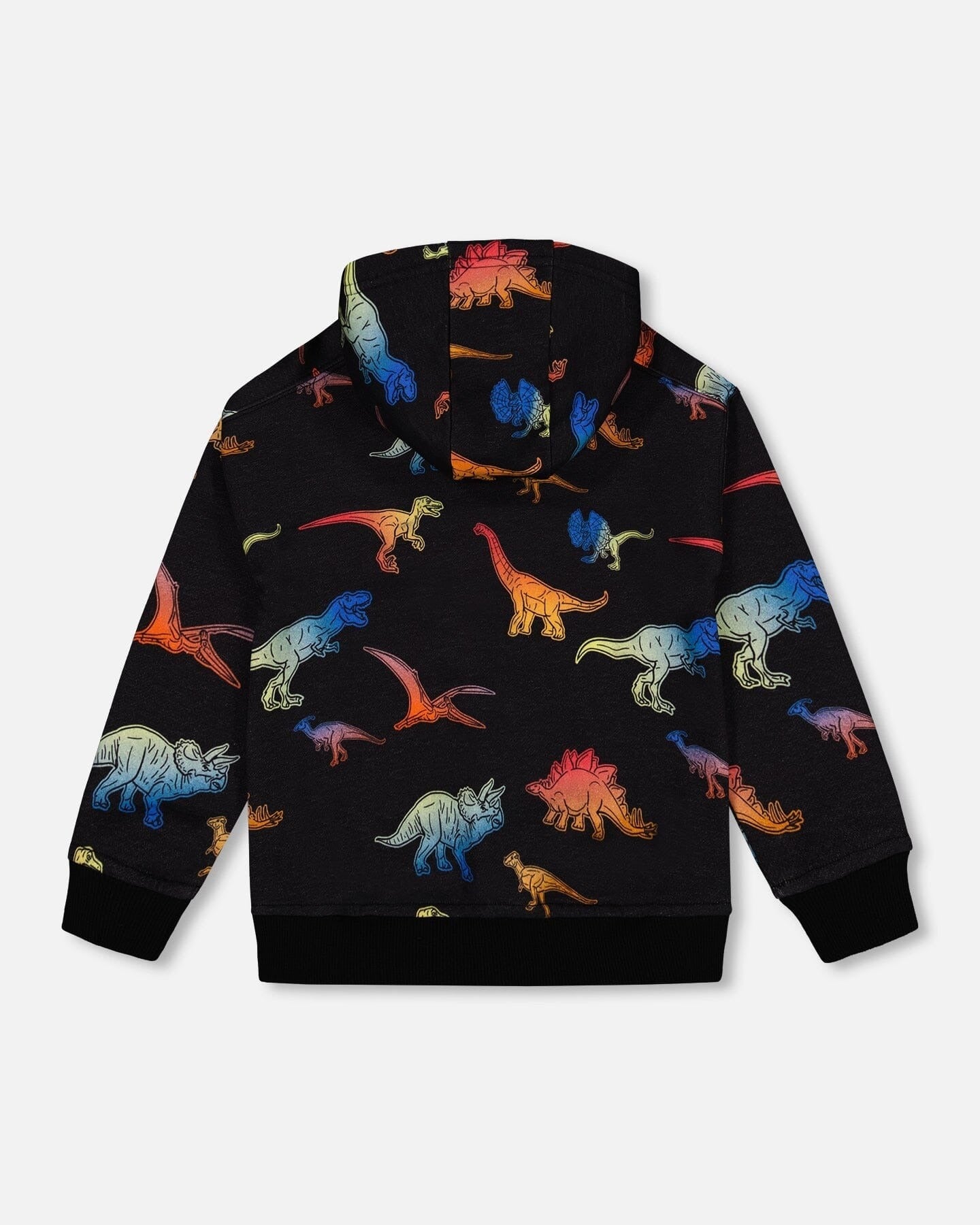 Our Printed Multicolor Dino Fleece Hoodie Black is a must-have in every active boy's wardrobe. Oh-so-soft and cozy in cotton/poly fleece, this pullover hoodie features long sleeves, a kangaroo pouch pocket, and a bold allover print with colorful dinosaurs. Mix and match with any type of bottom for a super cool head to toe look..