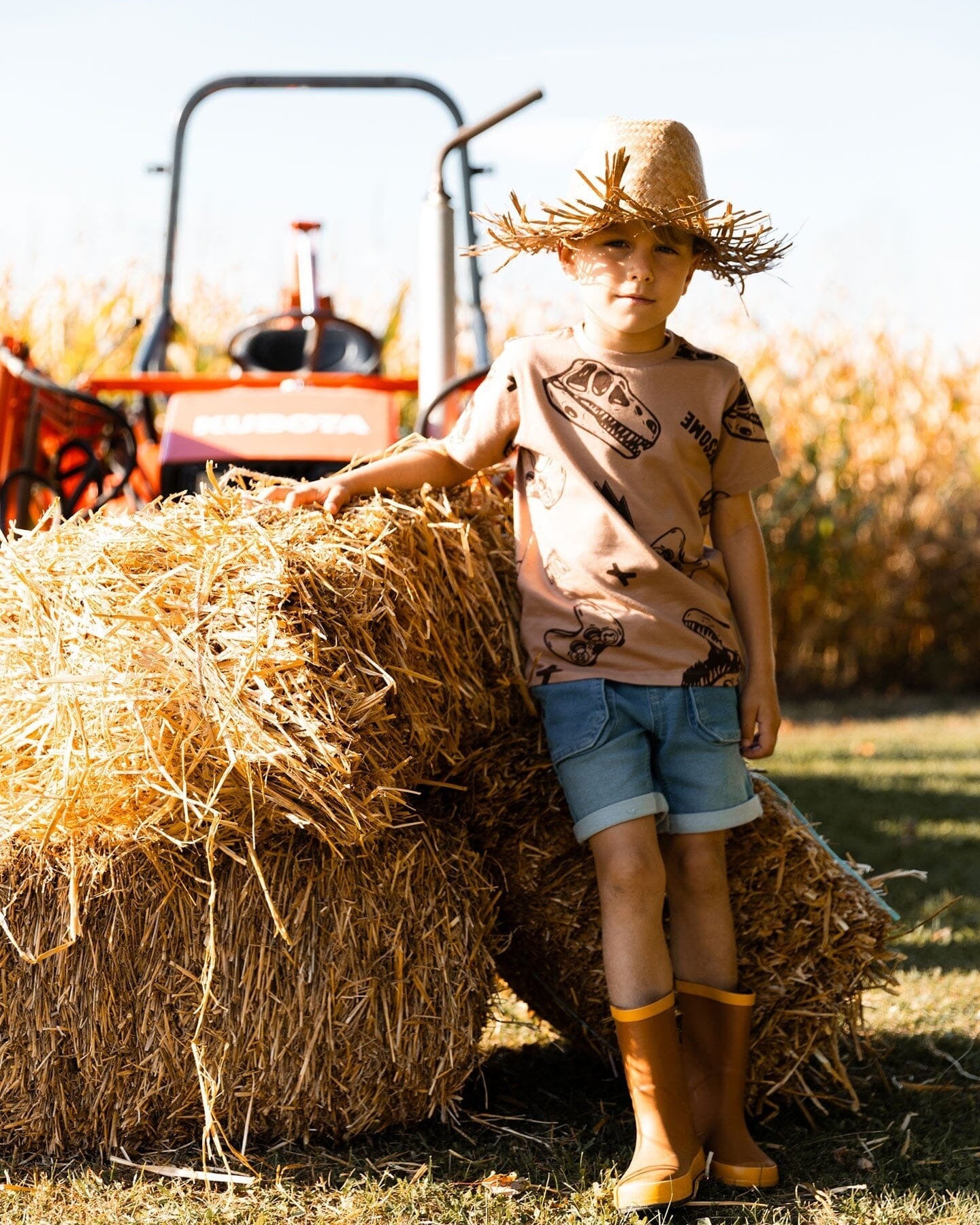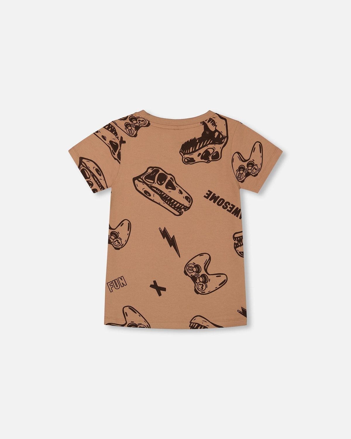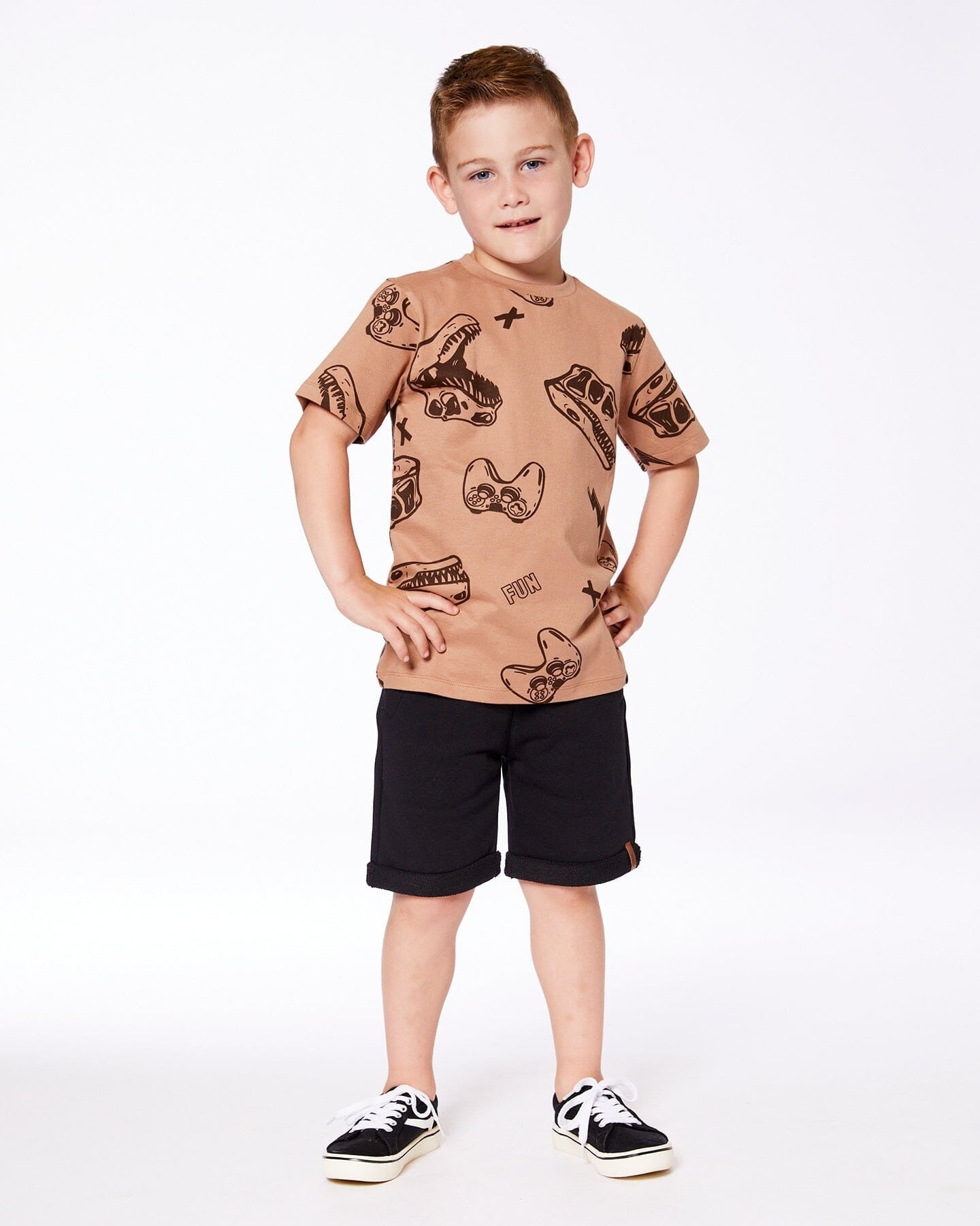 With dinosaur skeletons and video game controllers, our Printed Organic Cotton Tee Beige and Black Dinos adds instant style to his warm weather wardrobe. This adorable tee is made from soft stretch cotton and features short sleeves, a crew neckline, and a bold allover print.