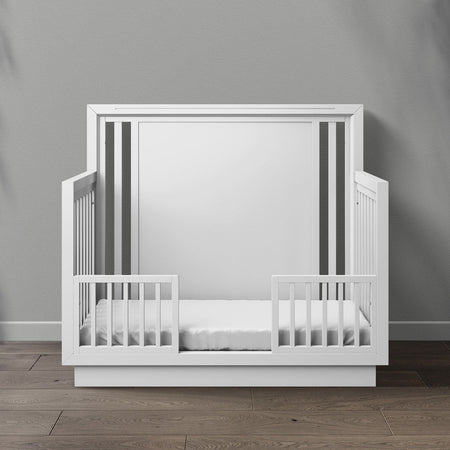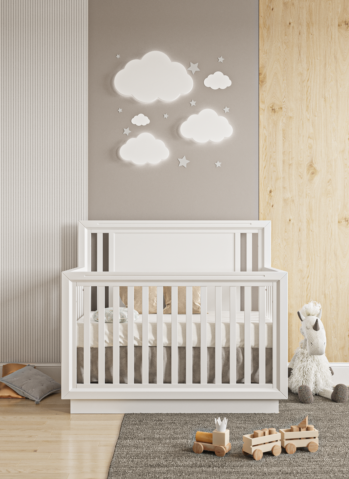 Quadro Convertible Crib exceeds the most exigent safety standard and design expectations. Sculpted in solid hardwood and finished with our signature organic paints this crib converts to a Day bed, Toddler bed and full size bed. For convenience and functionality, three mattress height settings ensure easy access. This collection is available in 8 remarkable finishes.