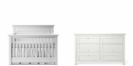 The Romina Karisma Convertible Panel Crib + Double Dresser is a great way to start your new nursery. This Romina Karisma 2-Piece package features two of our most popular selling items in one of our most popular selling finish, Solid White.
