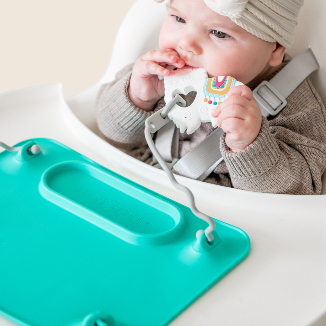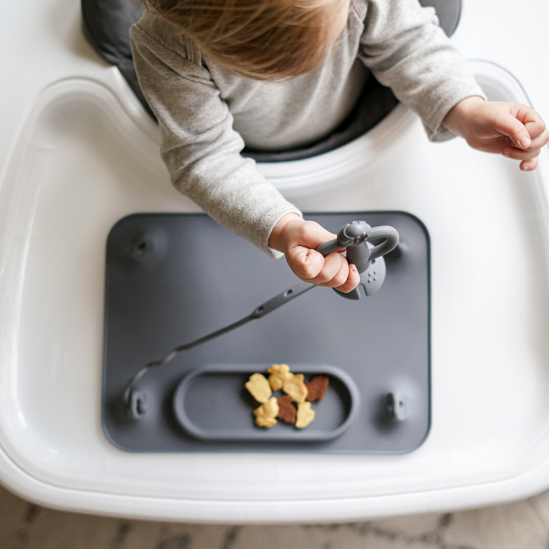 Supports Healthy Development Whether used during playtime or mealtime, our Mat and tether system supports sensory development and fine motor skills, builds problem-solving skills, and encourages their independence as they begin to feed on their own.