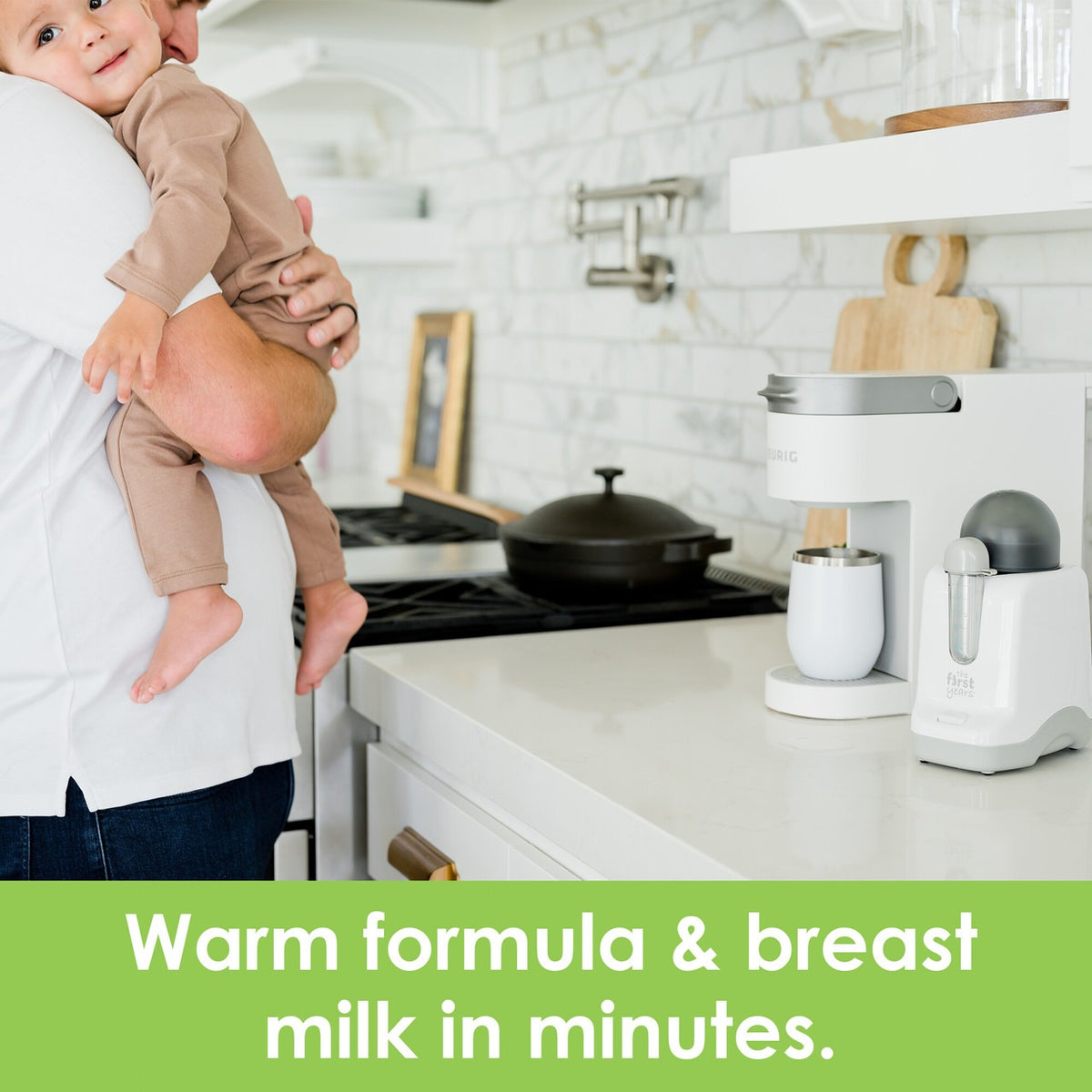 The First Years Simple Serve Bottle Warmer makes feeding easier, any time of the day. It’s a great choice for new parents, day cares and more! This baby bottle warmer heats up breast milk, formula and baby food jars in just minutes. It’s a safer alternative to microwaving and other heating methods that are less precise and can be more time consuming. The Simple Serve is easy to use: simply add the desired amount of water to the vial, pour it in, add your bottle and push the button. It really is that simple! When the warming light turns off, the machine automatically shuts off and your baby's bottle is ready. Designed to hold most baby bottle styles that parents already own; there are no specialized bottles to buy. The basket can also be used to sanitize pacifiers: up to two at a time. The compact size fits easily on the counter, nightstand, or wherever works best in your own home. It even includes a vial you can prefill to your desired measurement, making middle of the night feedings easier.