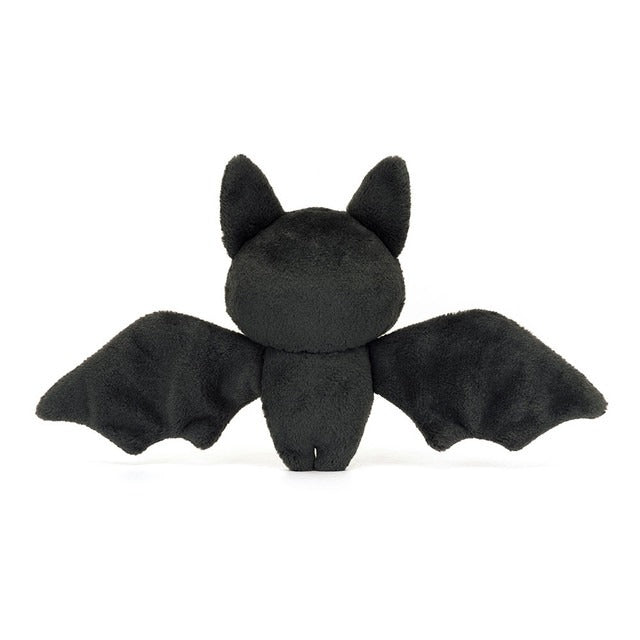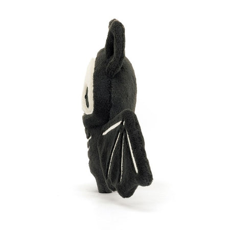 Get into goth mode with Skelebat Jim! This Halloween bat has soft slate fur and stiffened fan wings stitched with delicate bones. With a suedette skull and sweet fold ears, Jim is far from scary, though he does like to sleep upside-down.