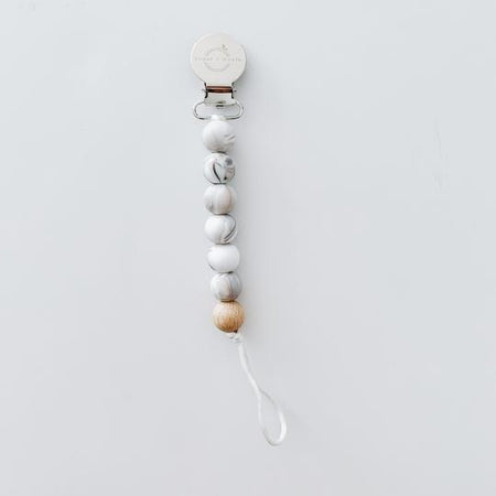 Sugar + Maple Silicone Pacifier + Teether Clip - Marble. Keep your little one's pacifier, teether, or security blankie close at hand with this picture-worthy silicone pacifier clip. The safety tested metal clip affixes to your baby's clothing at one end and secures with a loop around most pacifiers, teethers, and other small toys or security size blankets. Soft, smooth silicone beads form a tether that is just the right length for baby to be able to bring a pacifier or teether to the mouth. Never lose your little one's important soother when you're out and about. And like all sugar + maple products, your purchase of sugar + maple Paci Clips supports family owned businesses.