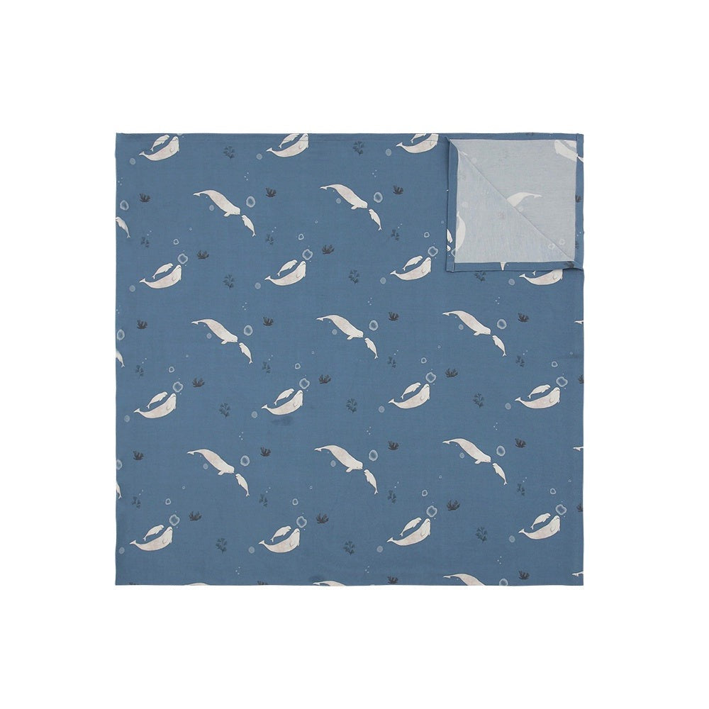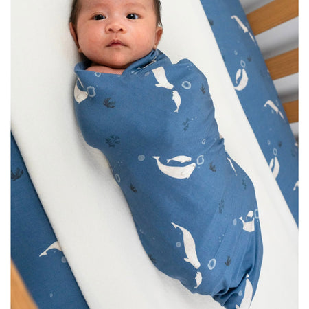 Fabric is digitally printed with our custom Belugas print on a dark blue background. This playful aquatic print features mama and calf Beluga whales together with underwater foliage and bubbles.