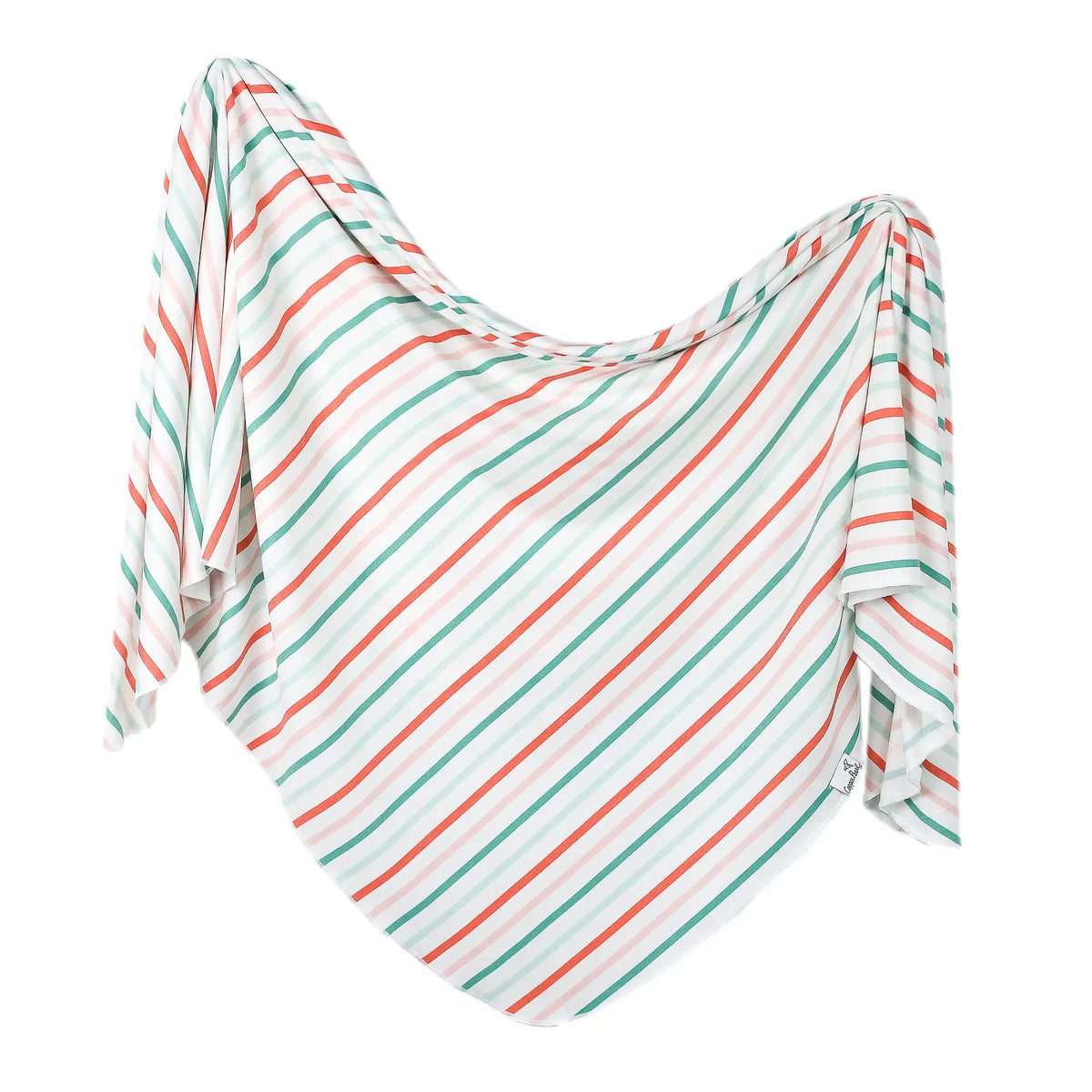 The Copper Pearl Tinsel Knit Swaddle Blanket is great as the perfect swaddle or as an all-purpose receiving blanket