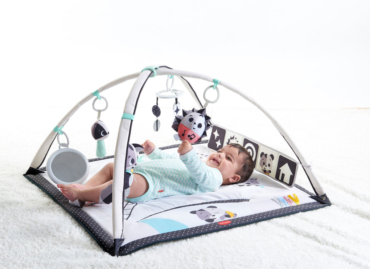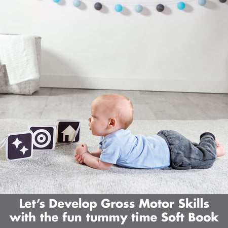 Let your little one explore the shapes on the soft black and white book or marvel at their own reflection in the mirror while practicing tummy time. The spacious and cozy play area let’s babies stretch and experiment with movement and roll over. The playmat's variety of textures, sounds and features provide ongoing auditory and tactile stimulation.