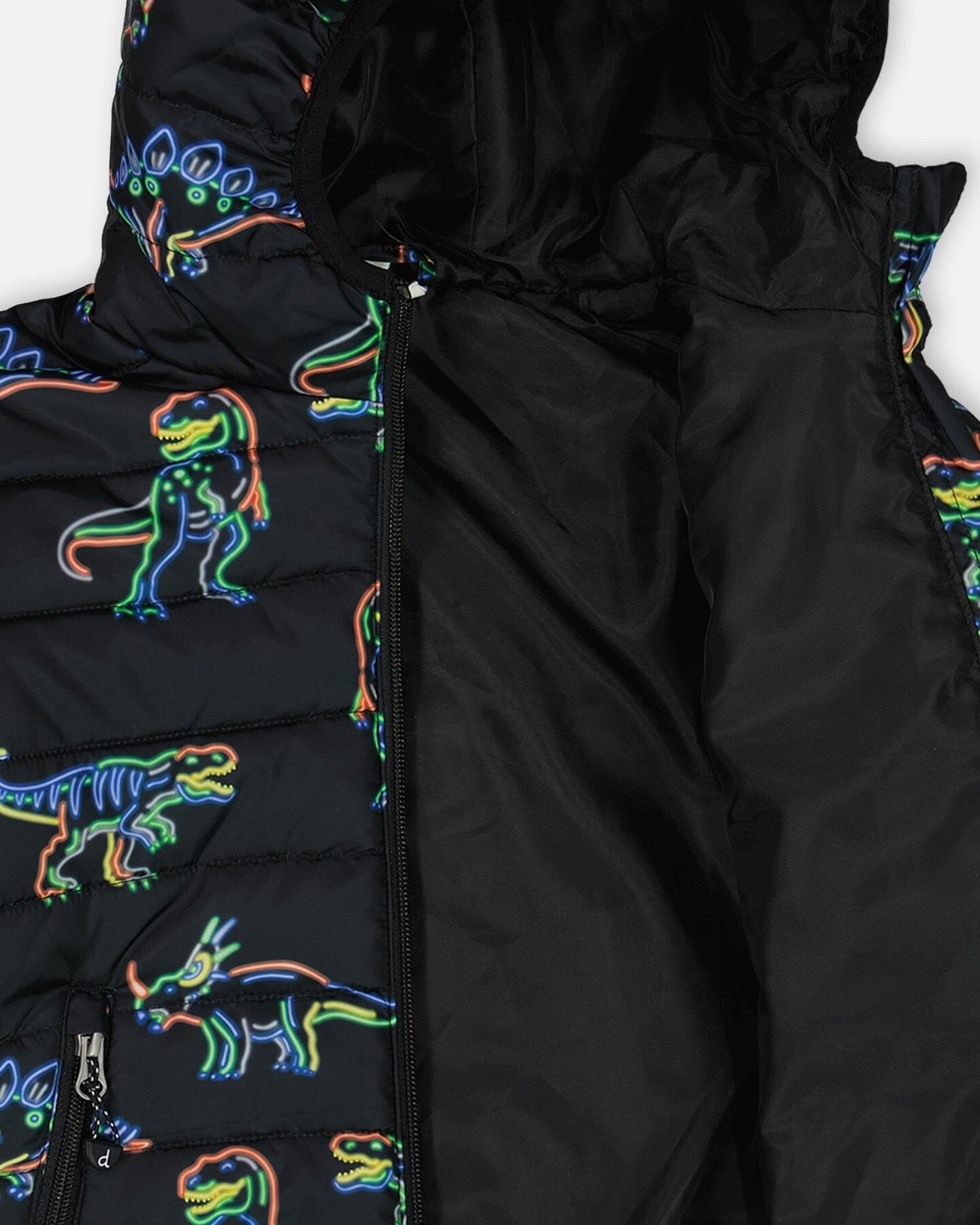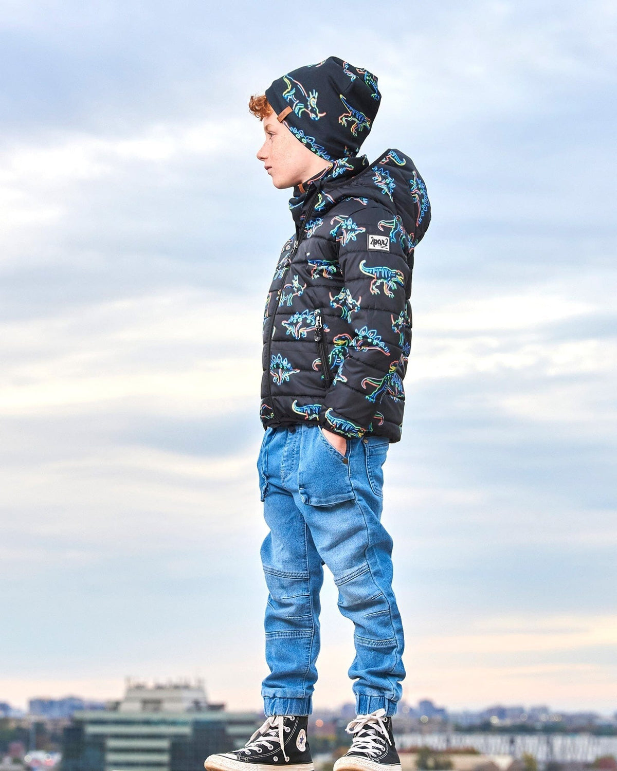 Our Quilted Jacket Black Printed Neon Dino is made for chilly days that call for an outer layer but don't require a heavy down coat. Detailed with an eye-catching allover dinosaur print, this jacket features horizontal quilting, an attached hood, a zip front closure, and slant front zipper pockets. Team it with a matching hat for a super cool look!