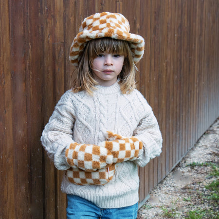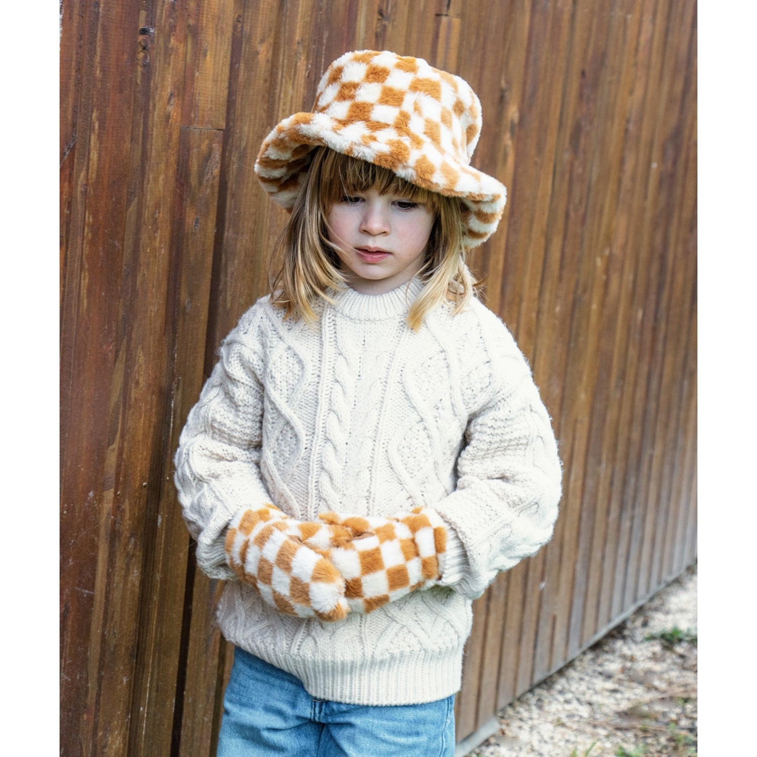 Our super soft bucket hat is designed in the cosiest faux fur and is fleece lined for extra comfort and warmth. In a wearable tonal check pattern, its available in sizes 3-6 years and 7-10 years.