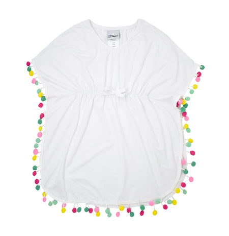 UPF 50+ Kaia Beach Swim Cover-Up: Your little girl will be comfy and cute on your next family beach trip or poolside outing with our UPF 50+ triple brushed cover-up dress. This super cute cover-up features our colorful prints with rows of white pom poms down both sides for a unique and adorable look your little one will love. Featuring a v-neck and relaxed-fit short sleeves, This toddler girls’ cover-up is made from 92% brushed polyester 8% Spandex for softness and comfort against her skin. Perfect for mixing and matching with her swimwear for lots of sweet summer looks, This cover-up dress is sure to become a favorite for all sunny days.