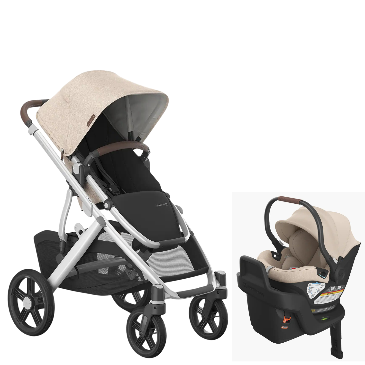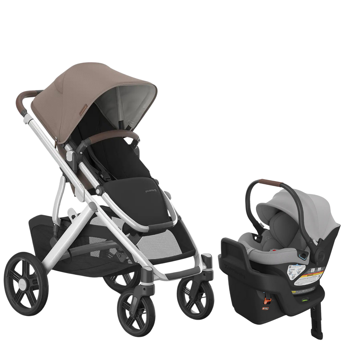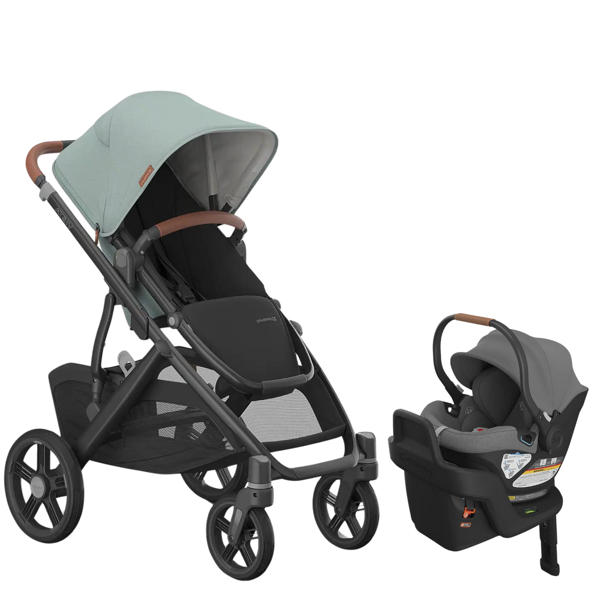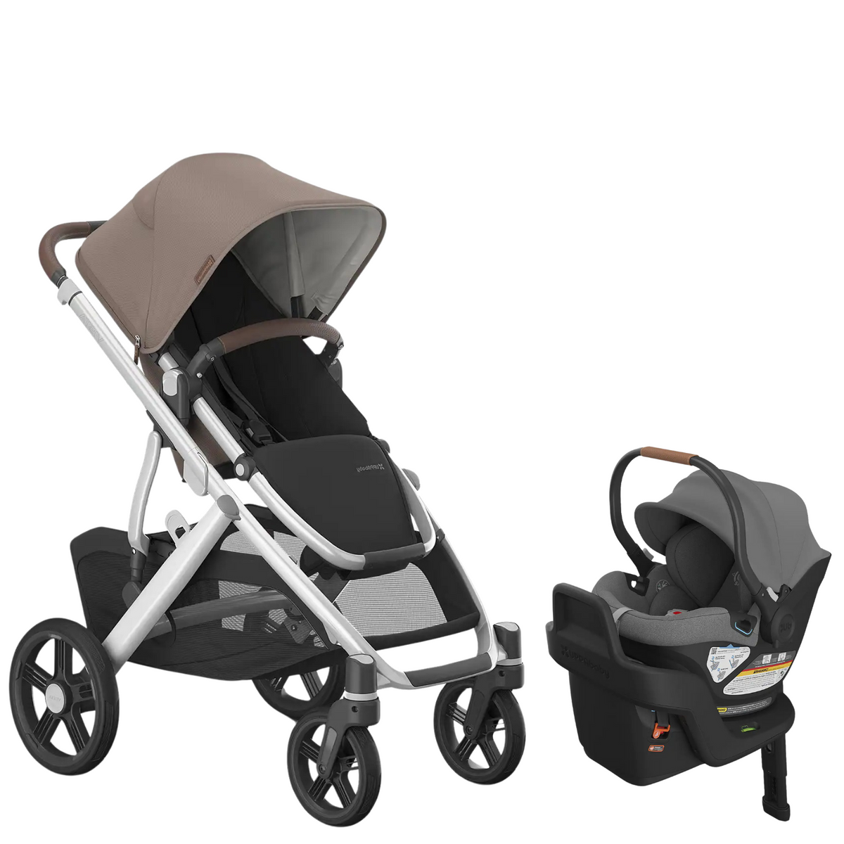 The UppaBaby Vista V3 + ARIA Travel System includes the UppaBaby Vista V3 Single to Double + ARIA Infant Car Seat in coordinating fashions.