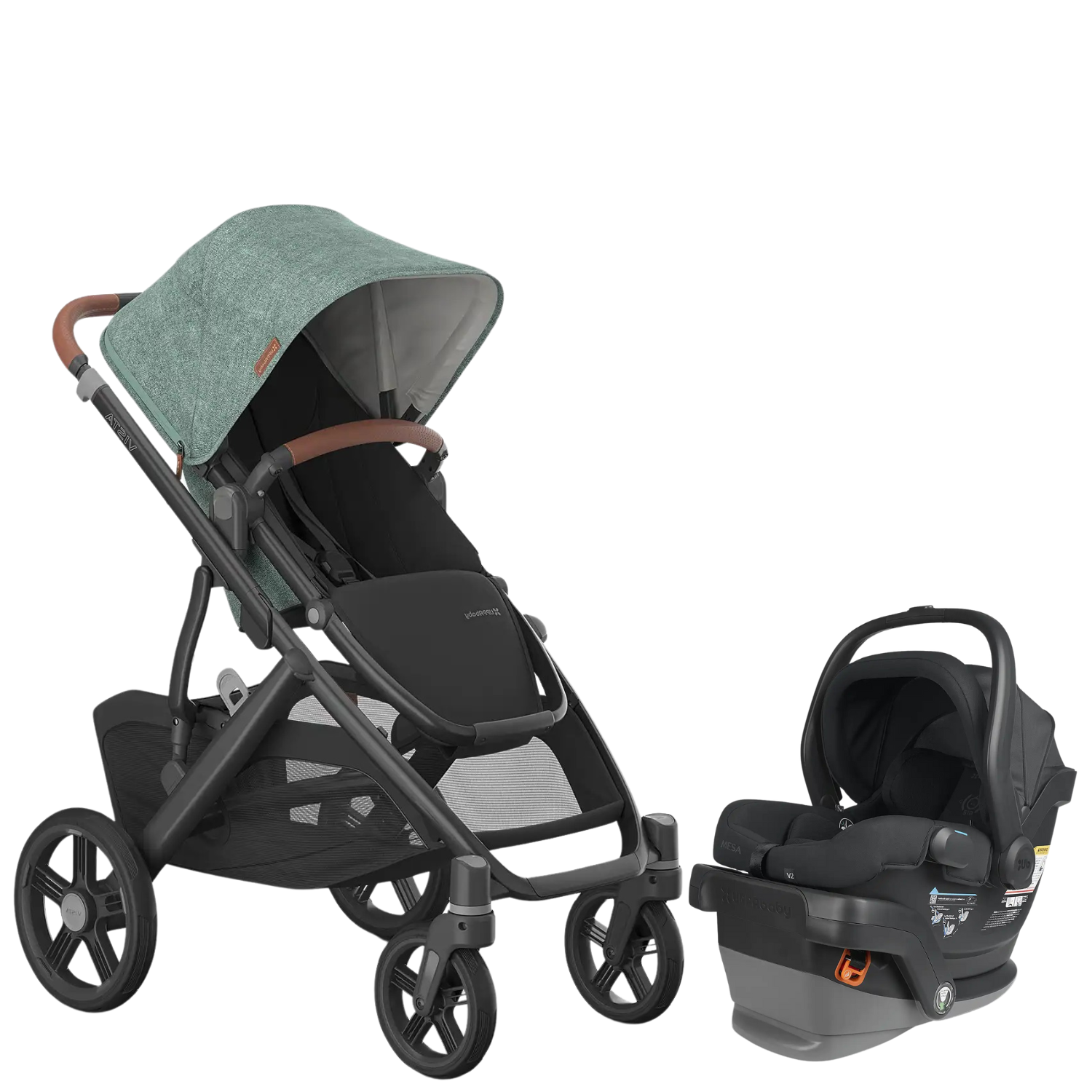 The UppaBaby Vista V3 + ARIA Travel System includes the UppaBaby Vista V3 Single to Double + ARIA Infant Car Seat in coordinating fashions.