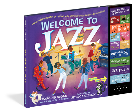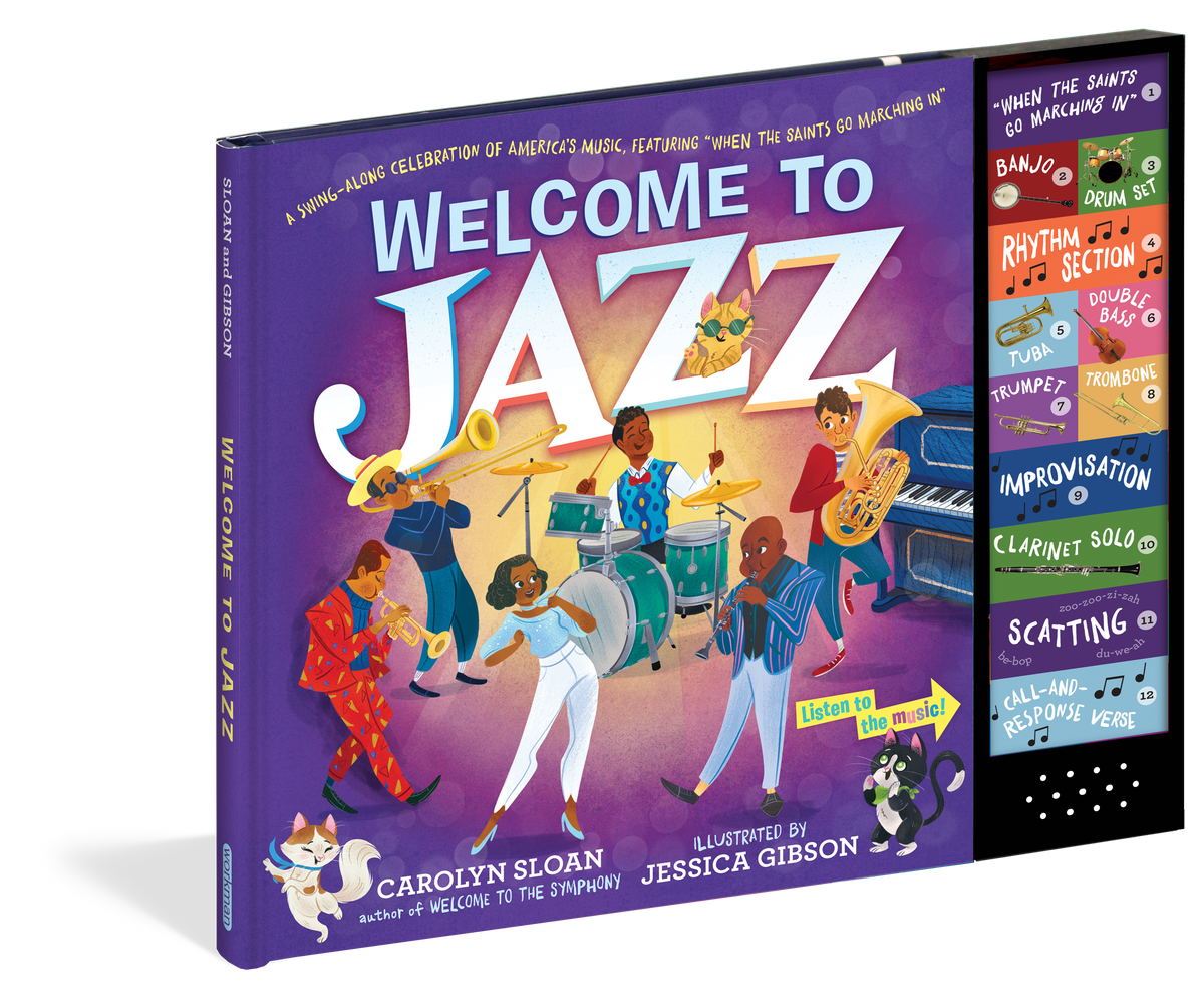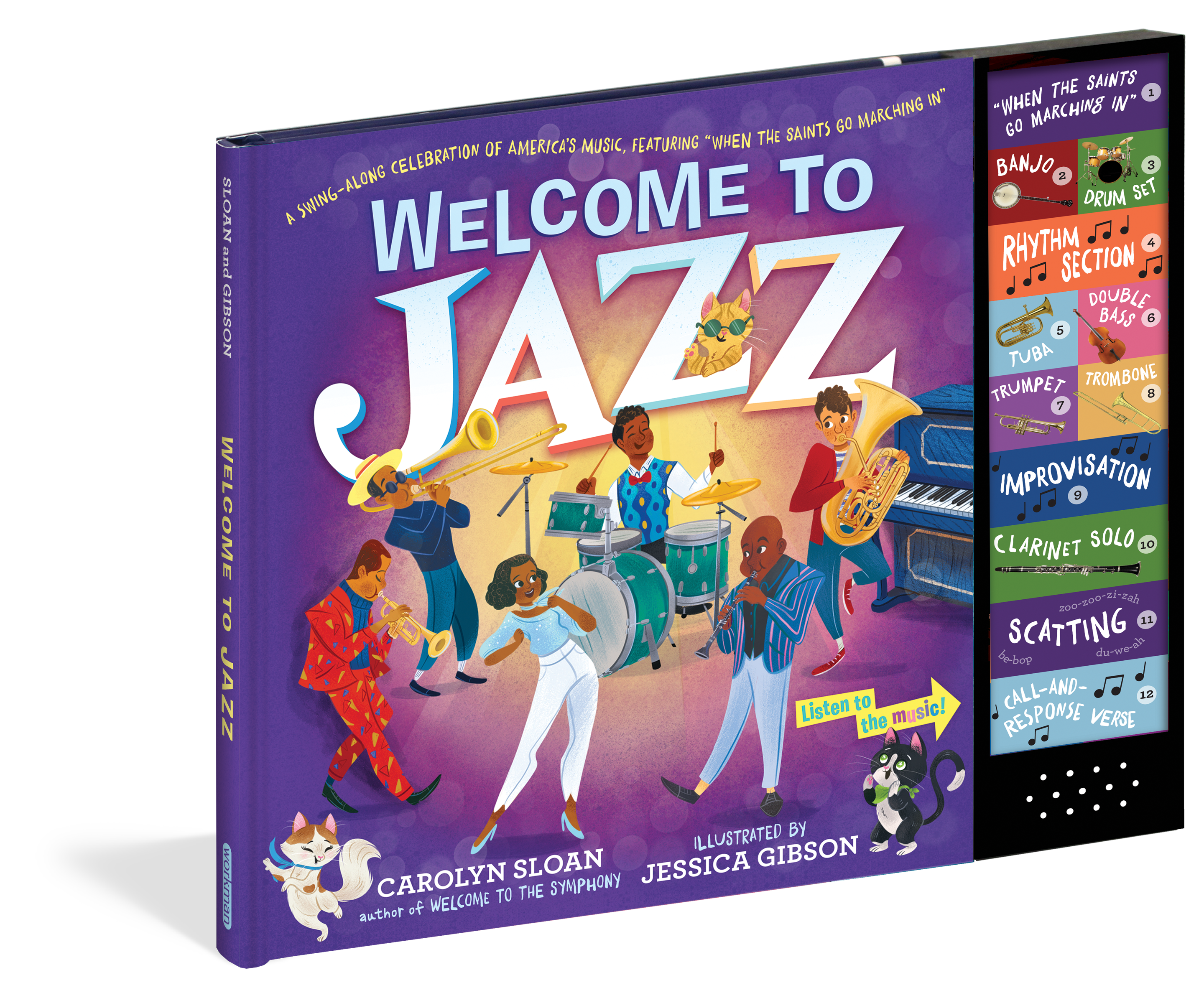 In this interactive swing-along picture book with 12 sound chips, you’ll hear the instruments of jazz—the rhythm section with its banjo, drums, and tuba, and the leads, like the clarinet, trumpet, and trombone. And you’ll hear singers scat, improvising melodies with nonsense syllables like be-bop and doo-we-ah!