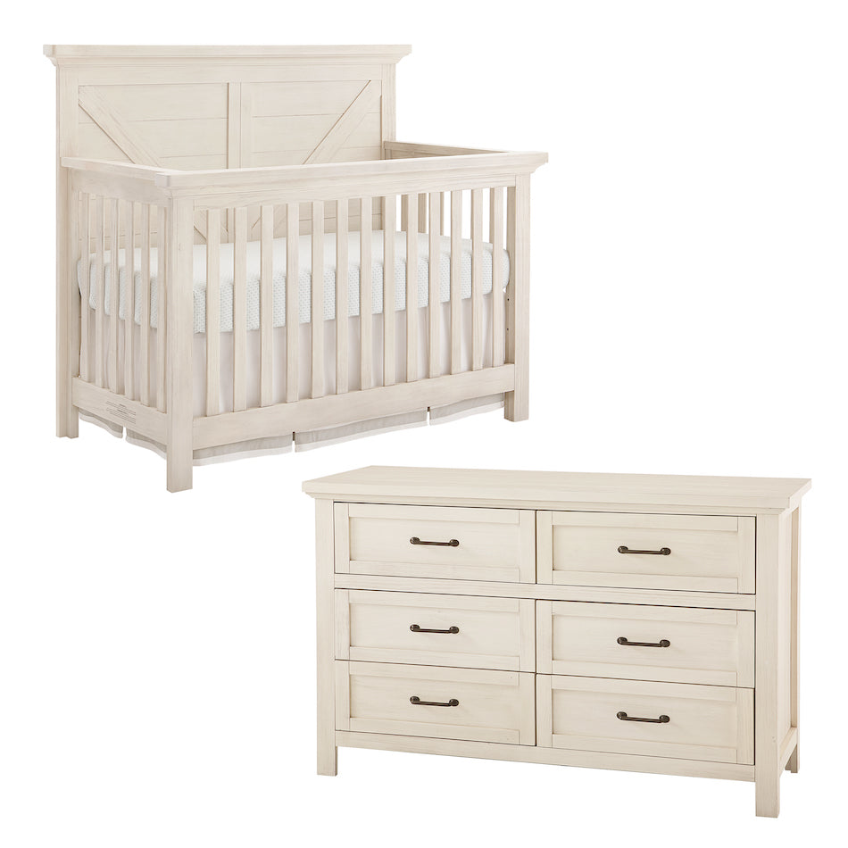 The Westwood Westfield Crib + Double Dresser - Brushed White includes the Westfield Convertible Crib paired with the matching Double Dresser. Add the changer tray or coordinating pieces to complete your nursery!