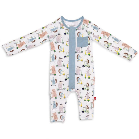 Piggies out with easy-on, easy-off, coveralls! A soft, stylish wardrobe staple ideal for indoor or outside play, and snoozin the night away. Perfect for nibbling toes, crawling, or going to market. Simply open the outfit, insert baby, and the smart magnetic fasteners practically close themselves! Machine wash as directed.