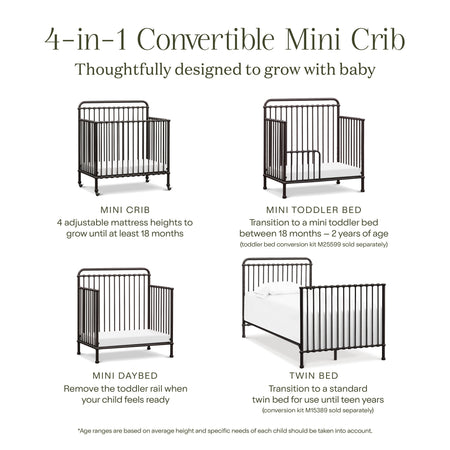 - 4-in-1 CONVERTIBILITY: Our cribs adapt as your baby grows, even in to their teen years. Designed to easily convert to a toddler bed, daybed, and twin-sized bed. (mini toddler bed conversion kit #M25599 and twin-size bed conversion kit #M15389 sold separately)