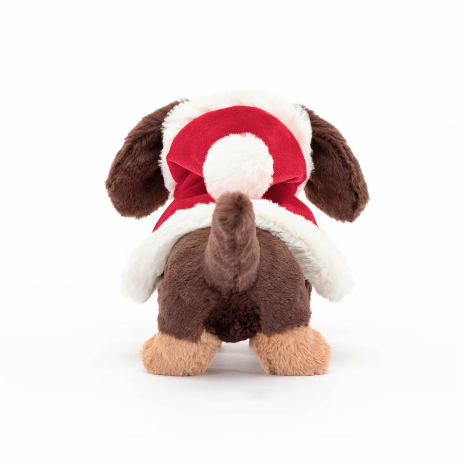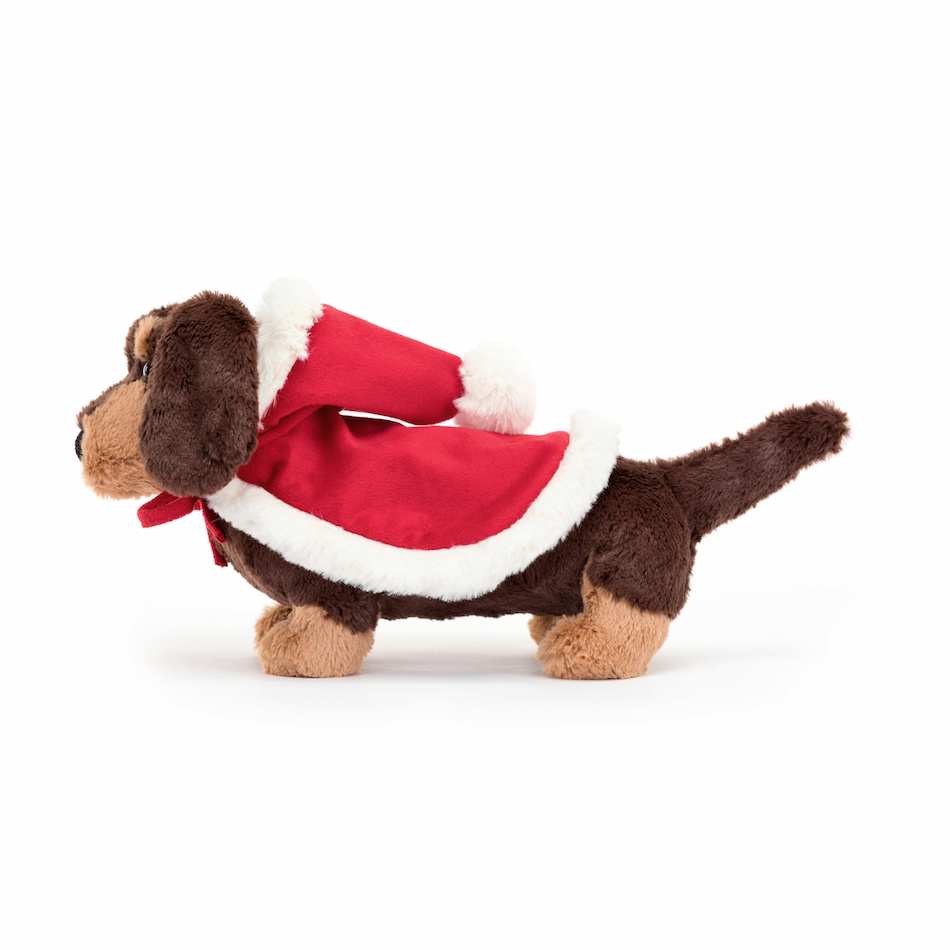 Winter Warmer Otto Sausage Dog is setting new trends for holiday fashion! This floppy-eared pup wears a bold red hat-and-cape combo, with a fleecy trim and bobble pompom, which fastens on with a red ribbon tie. It goes so well with Otto's cocoa fur, splashed with caramel patches!